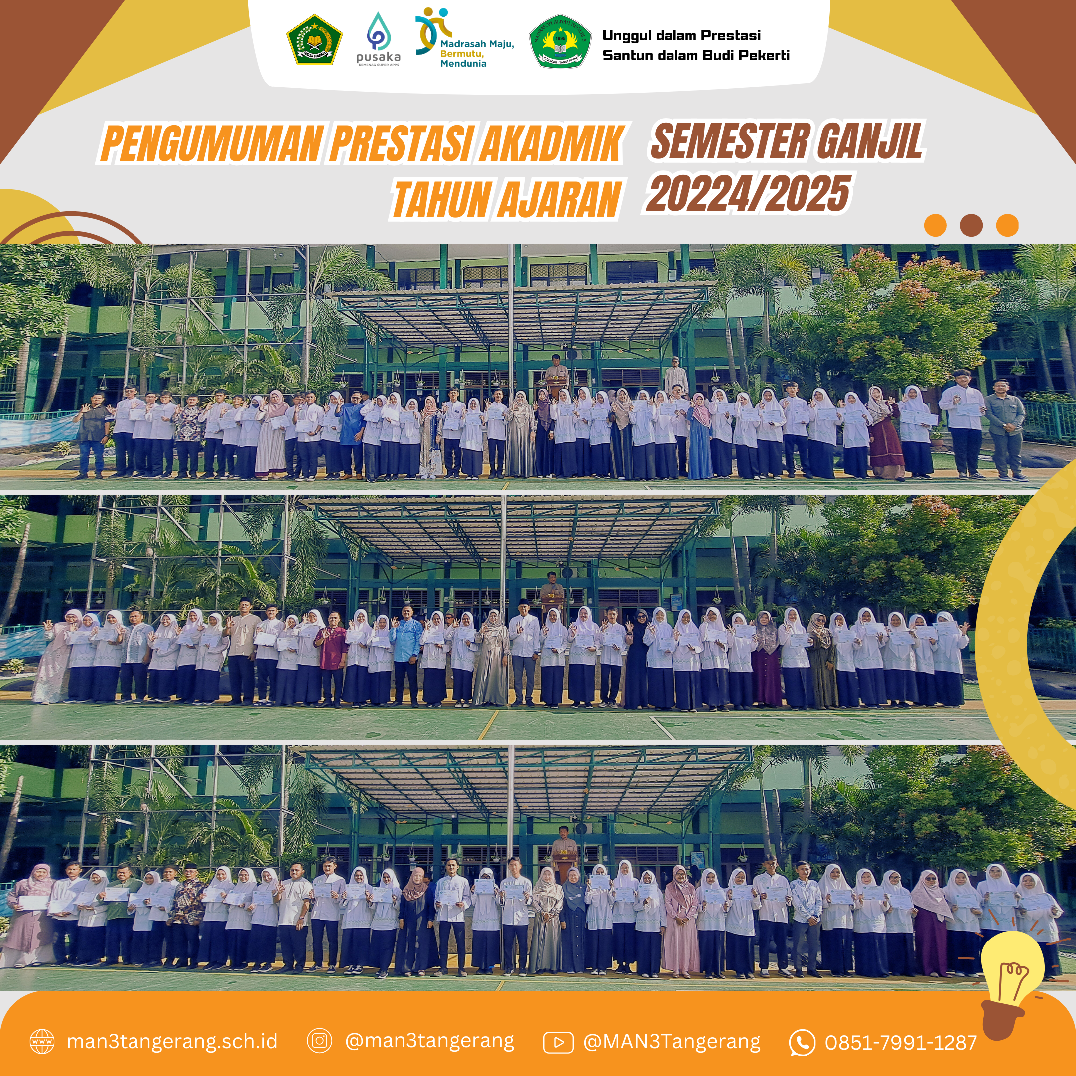 Tangerang, 20 Desember 2024 – MAN 3 Tangerang dengan bangga menggelar acara pengumuman dan pembagian hadiah bagi para siswa berprestasi pada semester ganjil tahun ajaran 2024/2025. Acara ini dihadiri oleh Kepala MAN 3 Tangerang, para guru, siswa, serta orang tua siswa.Dalam sambutannya, Kepala MAN 3 Tangerang menyampaikan apresiasi yang tinggi atas pencapaian para siswa. Beliau menekankan bahwa MAN 3 Tangerang bukanlah tujuan akhir, melainkan sebuah batu loncatan untuk meraih cita-cita yang lebih tinggi. "Kami bangga melihat kenaikan signifikan dalam jumlah alumni yang berhasil masuk ke Perguruan Tinggi Negeri (PTN) dan kampus ikatan dinas," ujar beliau.Beliau juga mengucapkan terima kasih kepada Wakil Kepala Bidang Akademik yang telah mempersiapkan acara ini dengan baik. "Semoga penghargaan ini menjadi motivasi bagi siswa lainnya untuk terus berprestasi," tambahnya.Statistik kelulusan tahun ini menunjukkan bahwa 40% siswa berhasil masuk melalui jalur SNMPTN, 50% melalui SBMPTN, 10% ke ikatan kedinasan, dan 10% ke kampus lainnya. Ini adalah pencapaian yang membanggakan dan menunjukkan kualitas pendidikan di MAN 3 Tangerang.Sebagai bagian dari upaya meningkatkan kualitas pendidikan, MAN 3 Tangerang berencana untuk memperkenalkan pembelajaran kitab kuning di semester depan. Ini diharapkan dapat memperkaya pengetahuan dan keterampilan siswa.Kepala MAN 3 Tangerang juga memberikan pesan semangat kepada seluruh siswa. "Tetap semangat bagi semua siswa, baik yang nilainya di atas maupun di bawah. Yang di atas harus bisa mempertahankan prestasi, dan yang di bawah harus berusaha lebih keras untuk meningkatkan," tutupnya.Acara ini diharapkan dapat memotivasi seluruh siswa untuk terus berusaha dan mencapai prestasi yang lebih tinggi di masa depan.MAN 3 Tangerang Gelar Rapat Pleno Semester Ganjil Tahun Ajaran 2024/2025